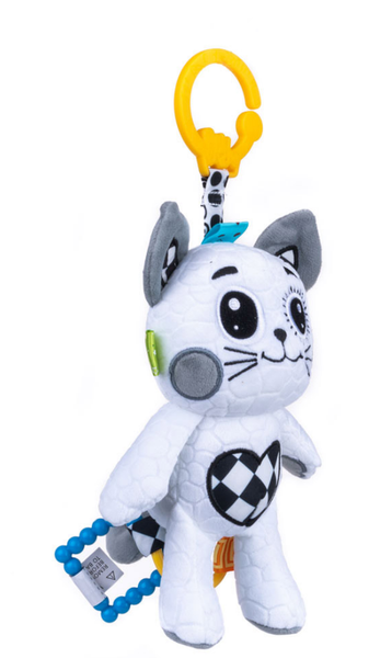 Kontrastowy kumpel, Kociak, ukołysze maluchy do snu słodką kołysanką. Posiada on kontrastowe wzory i kolorowe metki o zróżnicowanej fakturze, aby stymulować zmysł wzroku i dotyku maluszka. Doczepione do zawieszki gryzaczki przyniosą ulgę ząbkującym bobaskom. Dzięki praktycznej klamrze, przymocujesz Kotka w dowolnym miejscu, aby mógł wszędzie czarować malucha uroczymi dźwiękami! Zabawka przeznaczona dla dzieci od dnia narodzin.