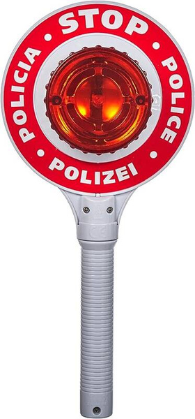 Policyjny lizak świetlny to doskonały dodatek do stroju karnawałowego, idealny do zabawy w policjanta. Z jednej strony oznakowany kolorem czerwonym "STOP", a z drugiej zielonym "GO" nakazującym jazdę. Lizak wyposażony jest w przycisk włączający czerwony sygnał świetlny.